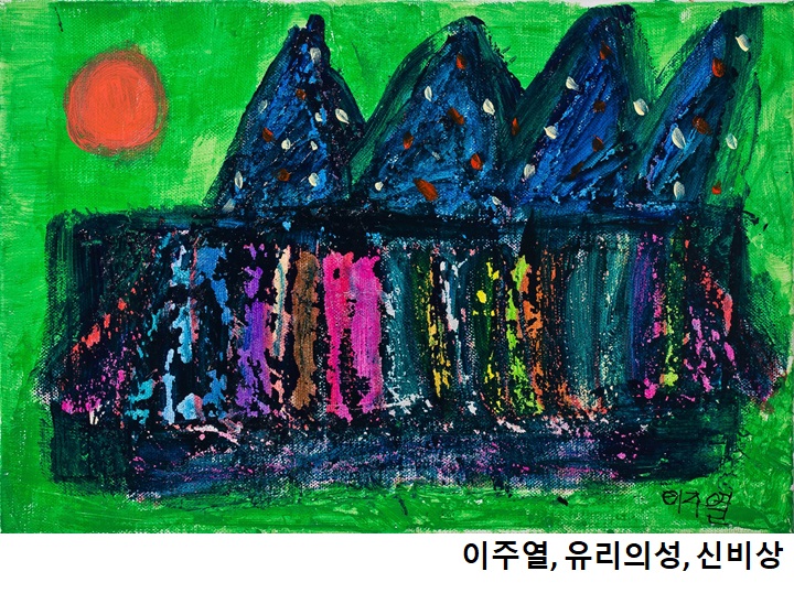 * 작가 노트 :지적장애 2급인 이주열작가는 뾰족한 삼각형 줄긋기 네모 등을 잘 표현한다.