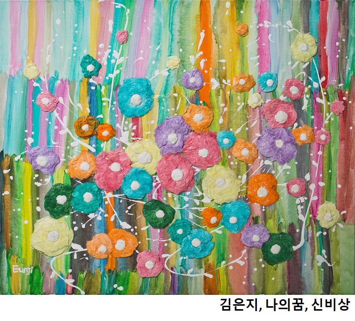 * 작품 소개 : 나는 여러가지 색을 섞어서 색동저고리처럼 아름다운 색을 만들었습니다. 한국 고유의 색과 전통한지를 구겨서 꽃을 만들었습니다. 바탕색과 어울리는 꽃을 캔버스에 붙여서 꽃밭처럼 꾸몄습니다. 그림 속은 나의 마음이며 아름답게 살고 싶은 나의 꿈을 표현했습니다.