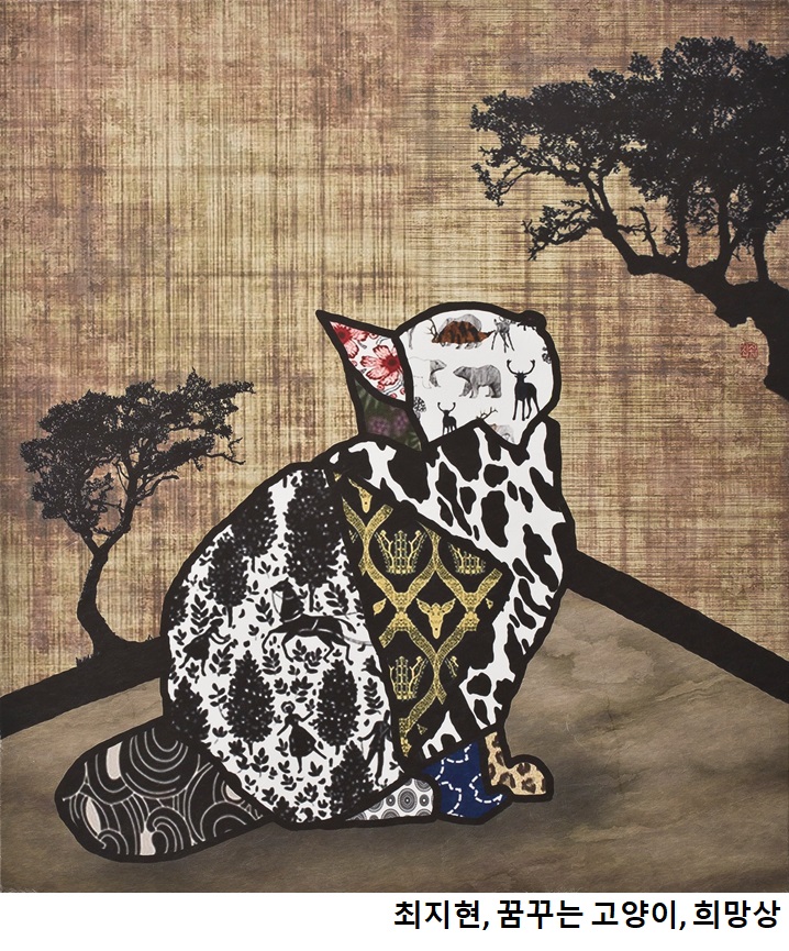 * 작품 소개 : 통증이 심해 자다가 몇번을 깨어나도, 늘 내곁에 있는 우리집 고양이를 보며 소소한 일상에서 느껴지는 편안함을 얻는다. 작년 유방암수술로 병원에 입원했을 때, 구겨진 병실커튼에서 보여지는 여러 고양이 무늬들을 보며 혼자있을 우리집 고양이에게 미안했다. 퇴원 후 집에 와선 우리집 고양이털에 비친 명암을 조각조각 나눠보기도 하고 고양이의 형태를 단순화 시켜 패턴으로 작업해 동양화의 현대적인 느낌을 강조하였다.
