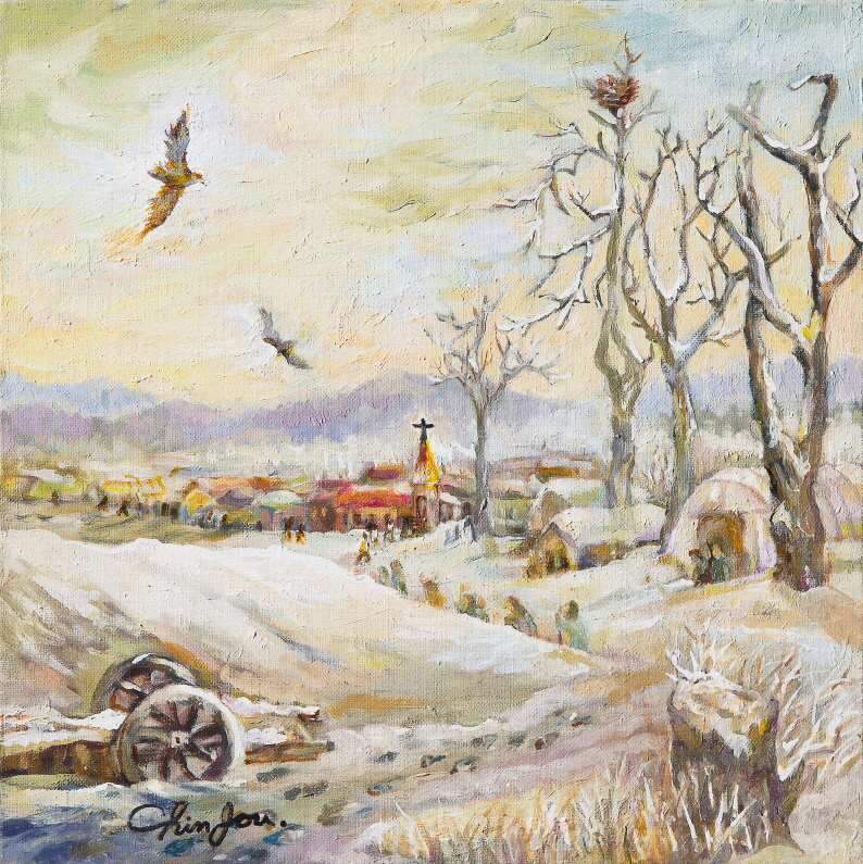 * 작품 소개 : 헛되고 헛되니 헛되어 헛되도다. 넘치게 가득채운 짐수레에서 무겁고 무거운 짐을 모두 다 내려놓는 순간 빈수레가 되어 돌아가는 길은 덜컹 더덜컹 시끄럽기는 해도 너무 가벼운 것이 좋았더라. 길 가에는 늙어 고목이 되어 곧 땔감이 될지라도 옆구리 시려오는게 싫어서 잠시라도 다시돌아올 새꿈을 꿈꾸어 보았다. 저어기 편안하게 쉬어갈 안식처로 가는 길. 빛과 진리와 생명이 있는 곳 멀리 보이는 십자가의 종소리가 은은히 울려 퍼질 때에 시골 촌노들은 안식처를 찾았고 그 길은 항상 평화가 깃든 아름다운 길, 헛되고 헛된 길은 아니였더라. 내 영혼을 모질고 강한 독수리의 날개짓으로 창공을 날고 싶은 소망을 이 작은 화폭에 곱게 담아 보았다.